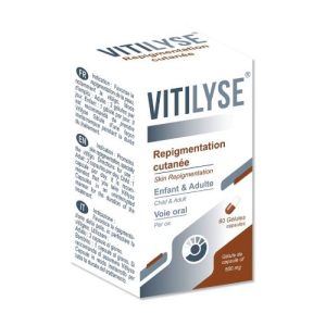 Vitilyse gélule est un complément alimentaire qui, grâce à la synergie de ses actifs, protège les cellules contre le stress oxydatif connu pour être à l’origine du Vitiligo et empêche l’apparition de nouvelles plaques.